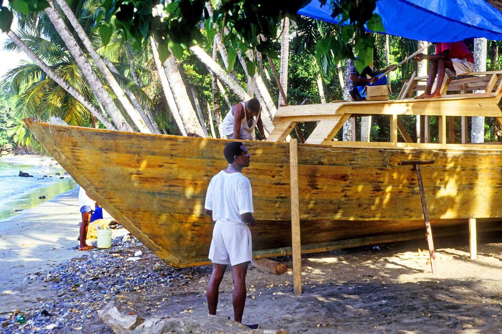 It looks like they are rebuilding their boat from the outside in. And, where is the work being done? Right on the beach. When the job's finished, a team of men should be able to pull it right into the ocean. [1992]